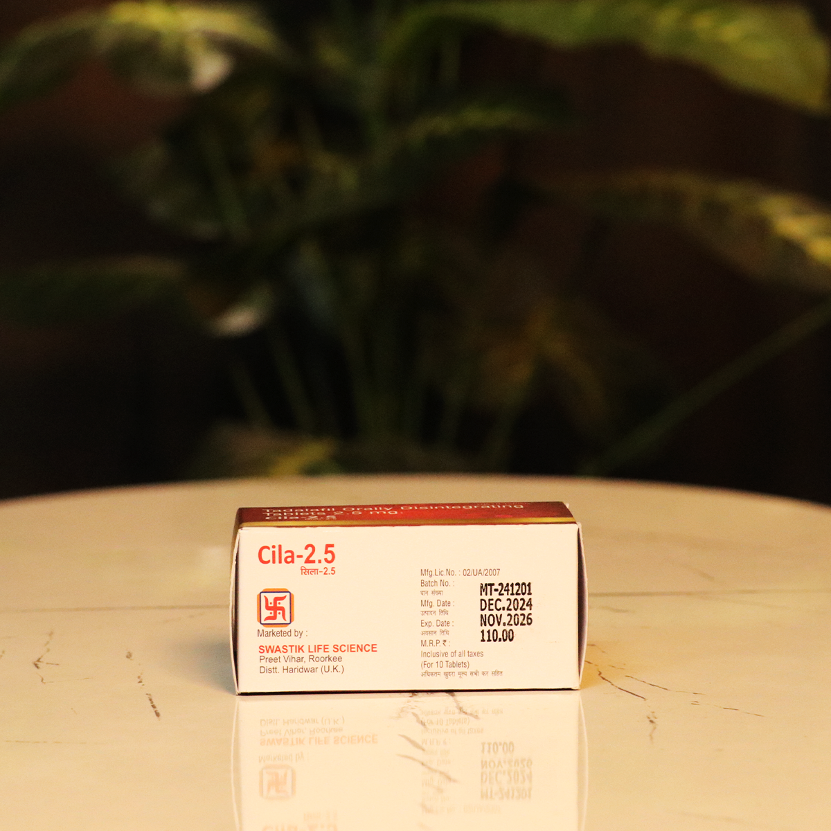 CILA 2.5 Tablets combine the power of Nebivolol (2.5 mg) and Cilnidipine (10 mg) to offer dual-action relief for individuals with high blood pressure. This clinically proven formula works by relaxing blood vessels and improving heart efficiency, resulting in better blood flow and lower pressure levels. Ideal for patients who require combination therapy, CILA 2.5 helps reduce the risk of complications like heart attack, stroke, and kidney damage. Each pack contains 10 tablets and should be taken as prescribed by a healthcare professional.