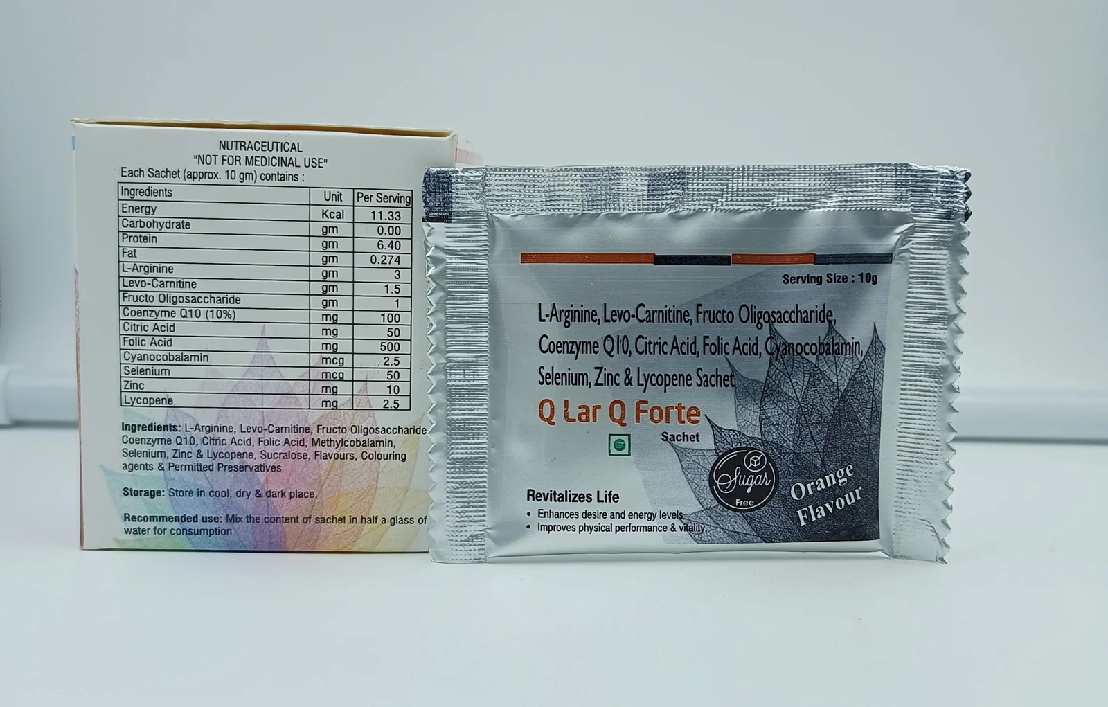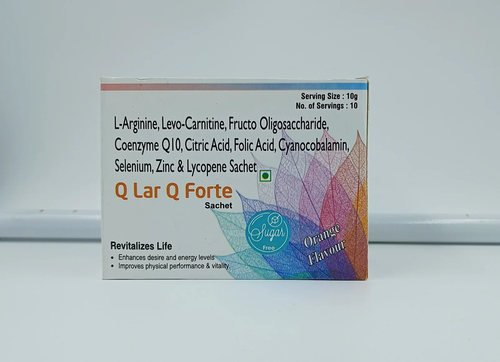 Q LAR Q FORTE is a comprehensive nutritional supplement formulated to support male reproductive health, cardiovascular function, and overall vitality. It is enriched with L-Arginine, Coenzyme Q10 (CoQ10), Folic Acid, and essential antioxidants that enhance nitric oxide production, improve blood flow, and boost cellular energy.